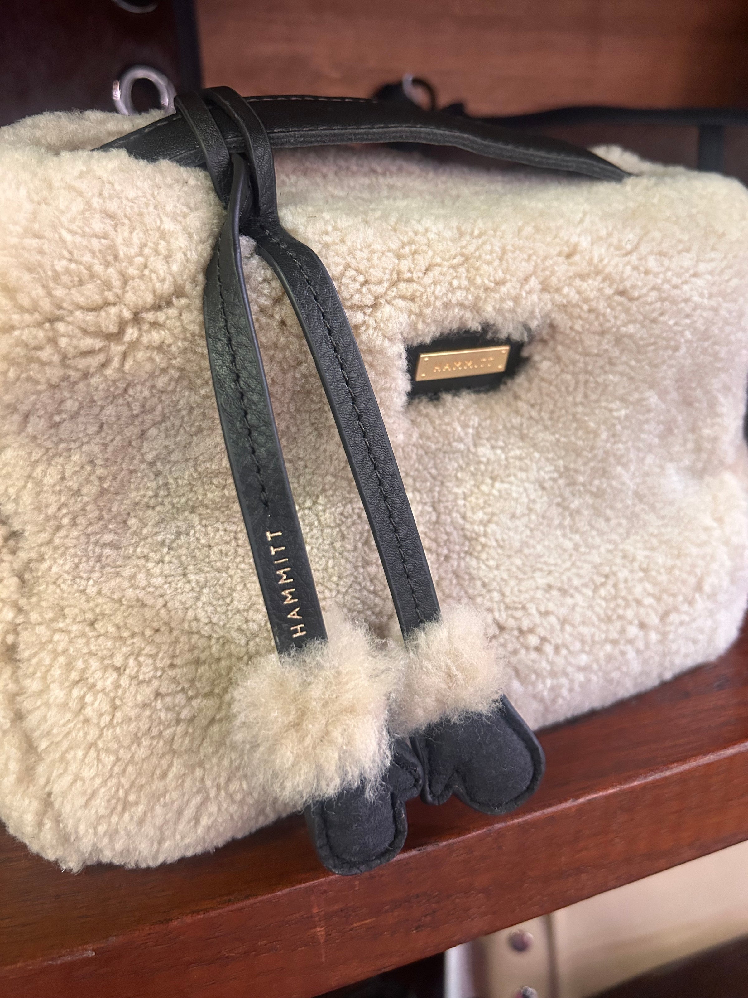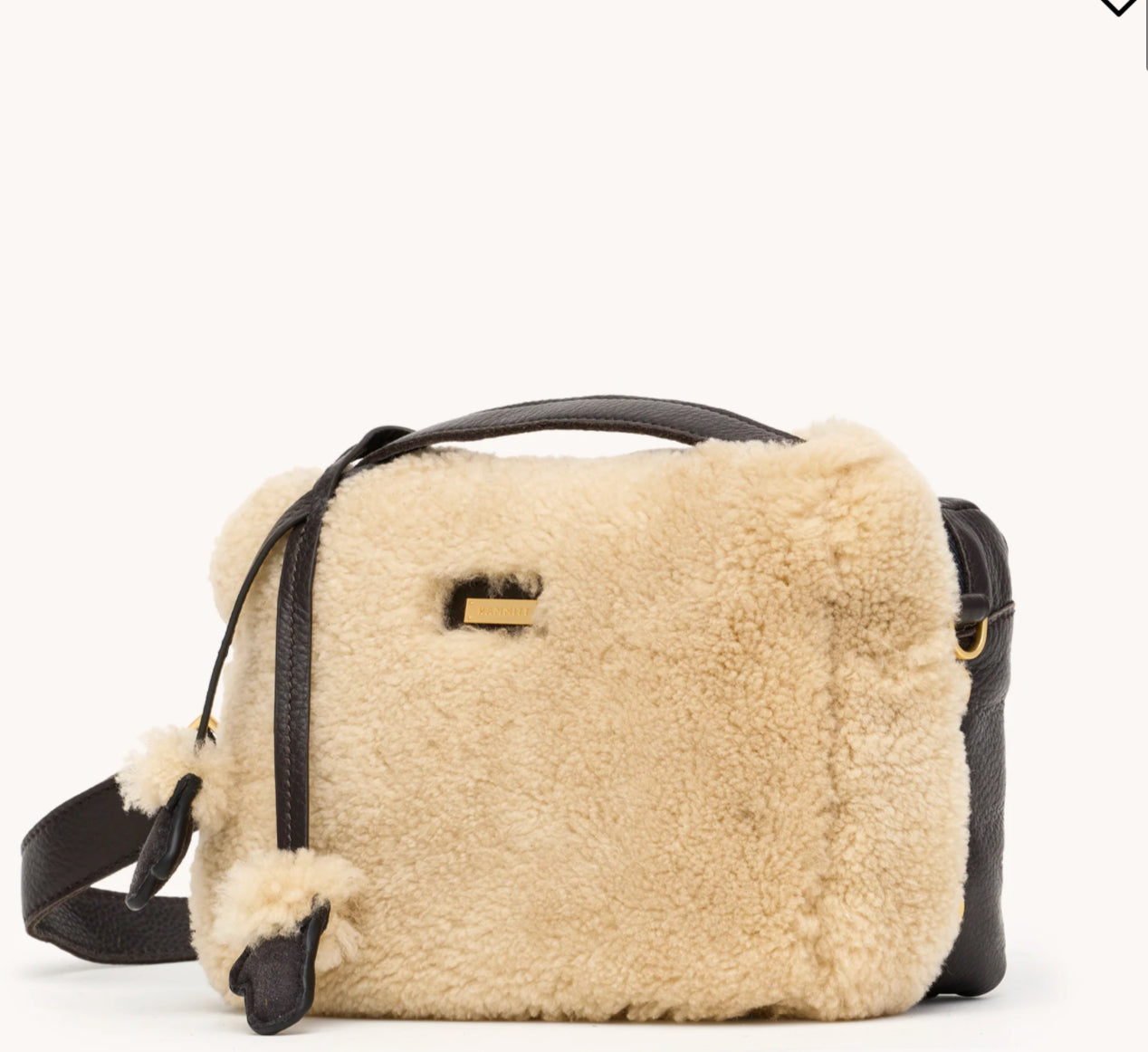 The very loved Evan Crossbody, but with a super fun winter twist. Shearling lamb skin and a deep brown pebble leather. A little mitten detail and brushed gold hardware rounds this bag's winter vibe out perfectly.
