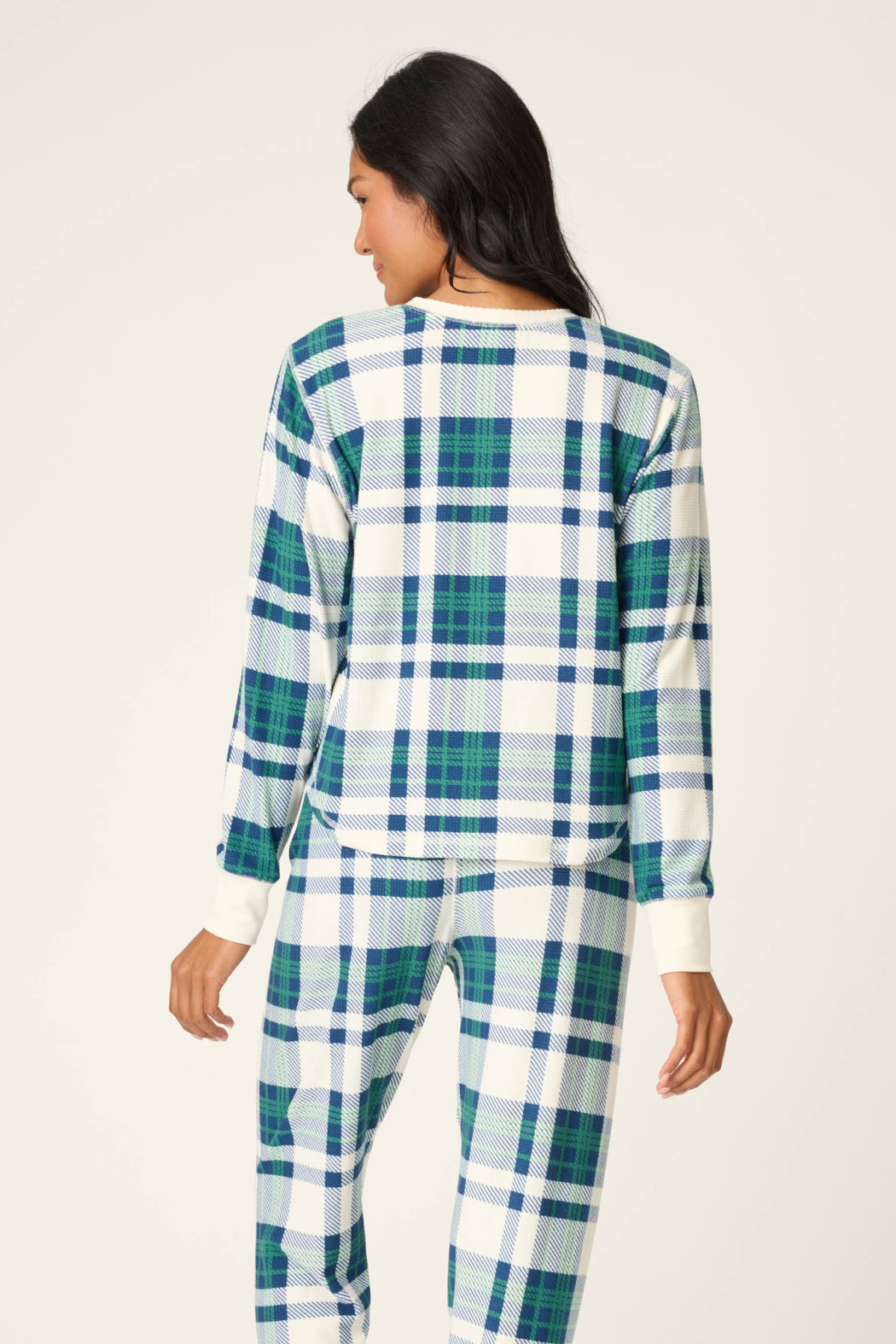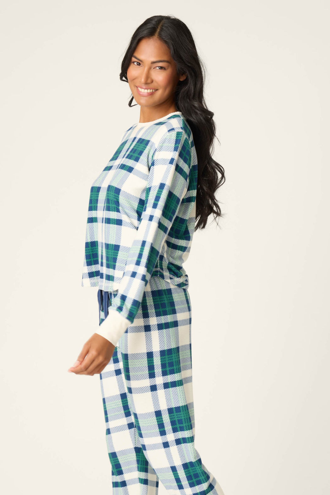 DESCRIPTION: We are totally mad for plaid over here! This long sleeve top is crafted in a dreamy thermal velour featuring an ivory background layered with a classic blue and green checkered print. This relaxed crewneck is perfect paired with the matching jogger or shorts.