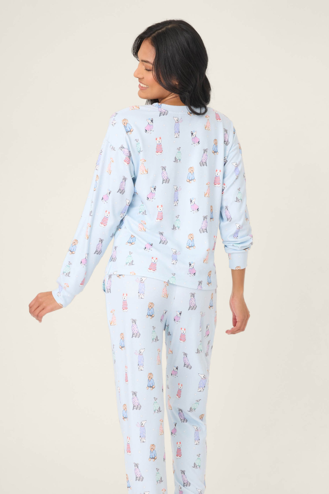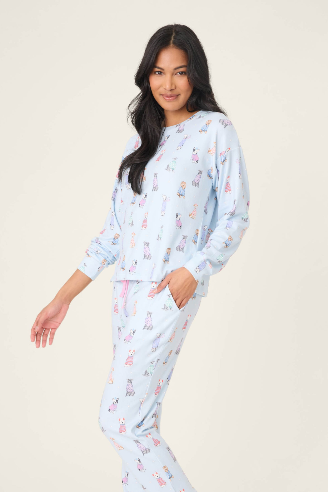 DESCRIPTION: Paw-sitively perfect loungewear! This long sleeve PJ top has a brushed pointelle fabrication for the softest feel with the cutest print. A hazy blue background makes home for playful pups in wintry attire, and sprinkled stars of snow! Your new snow day uniform awaits.