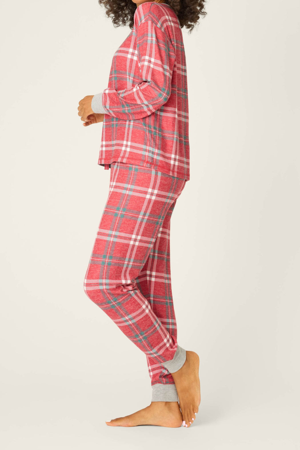 DESCRIPTION: There's nothing like the look of a classic plaid, with the feel of the softest peachy jersey material! This banded PJ pant features a contrast waistband and cuff, and is a fresh take on the traditional holiday jammie. This will be your go-to for cozy nights by the fire all season long.