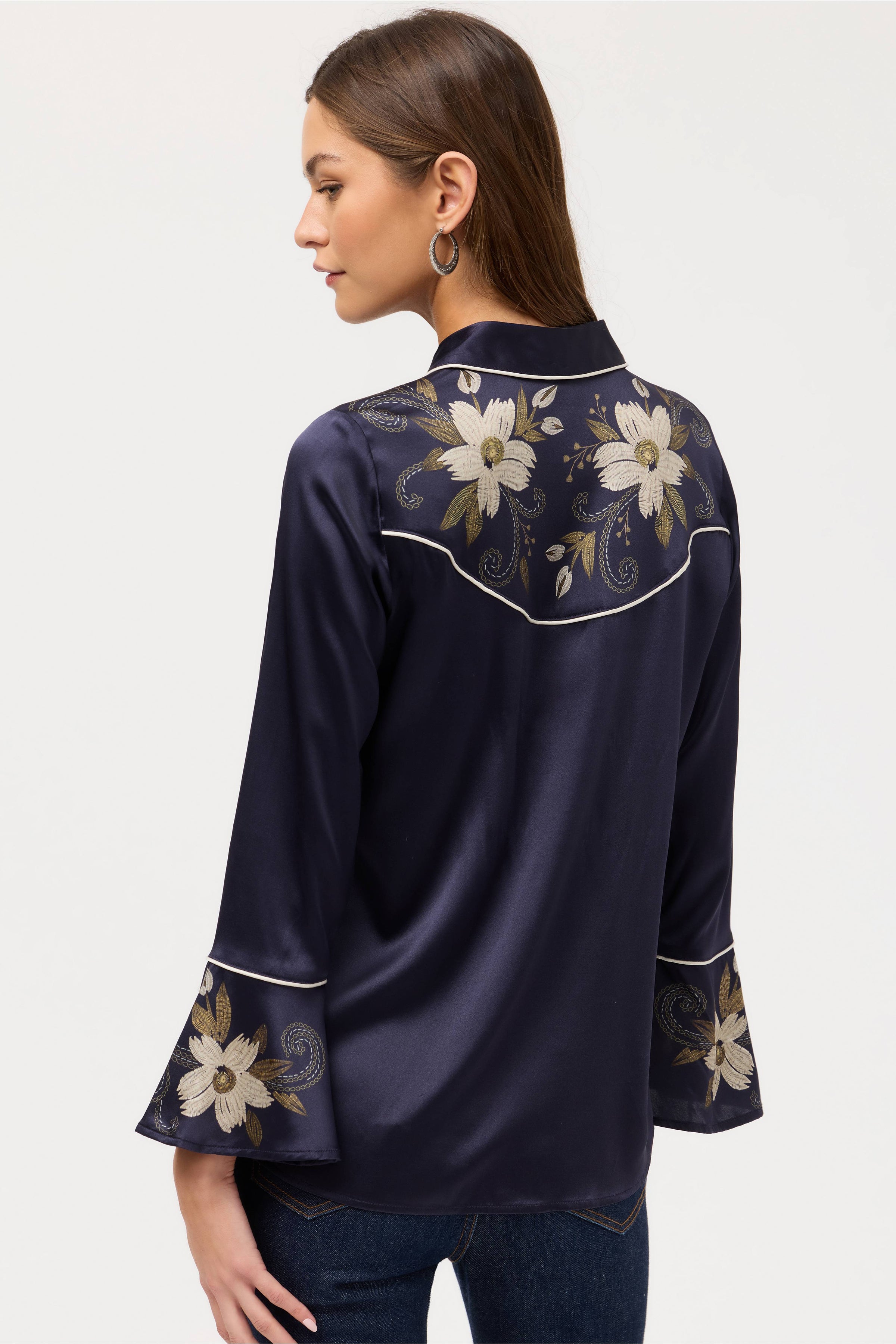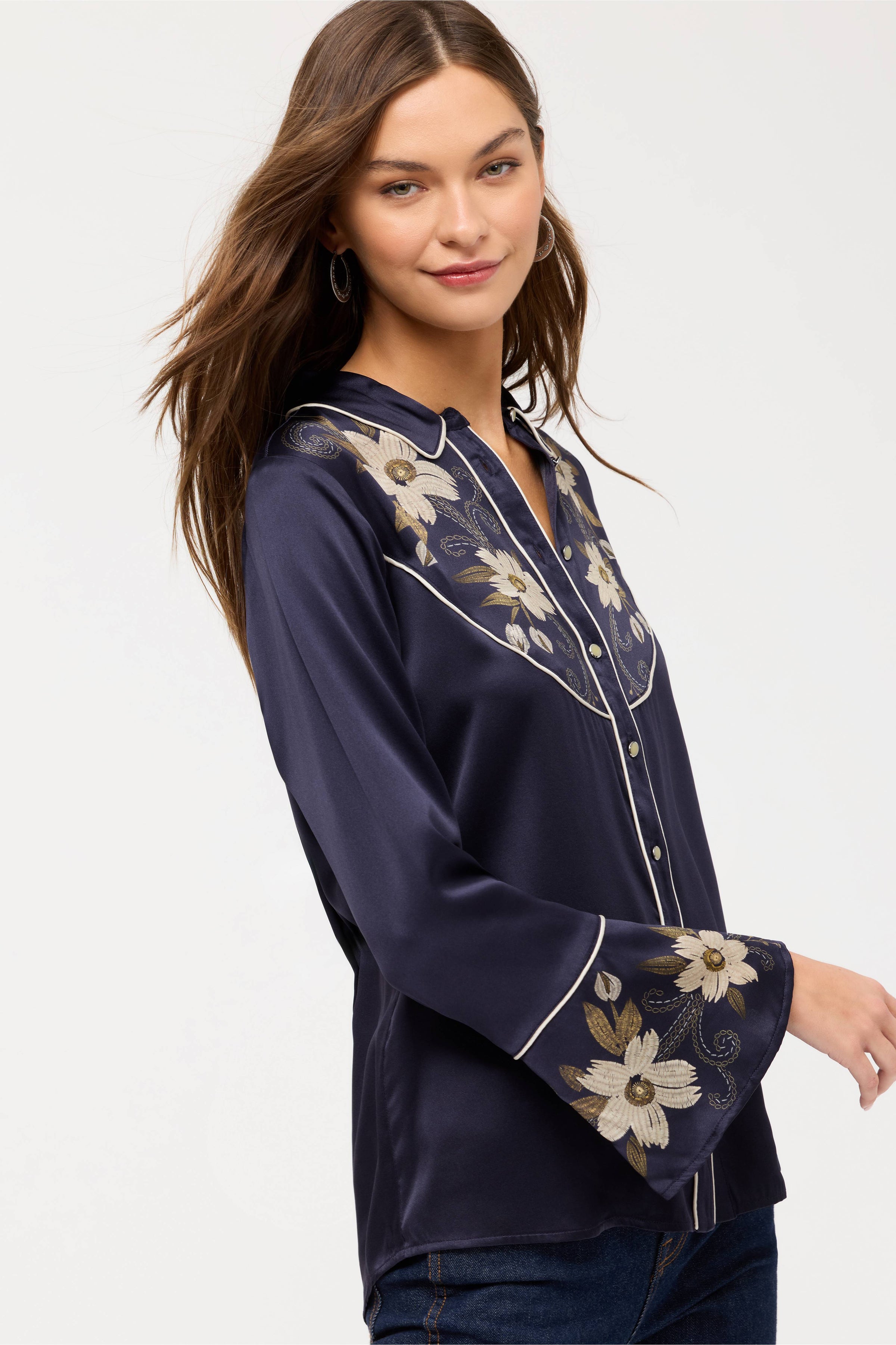 Wow! This is such a fabulous blouse! A Western style complete with piping and pearly snaps. You'll love the feel of this silk blend that is absolutely luscious. A wonderful style from Johnny Was!